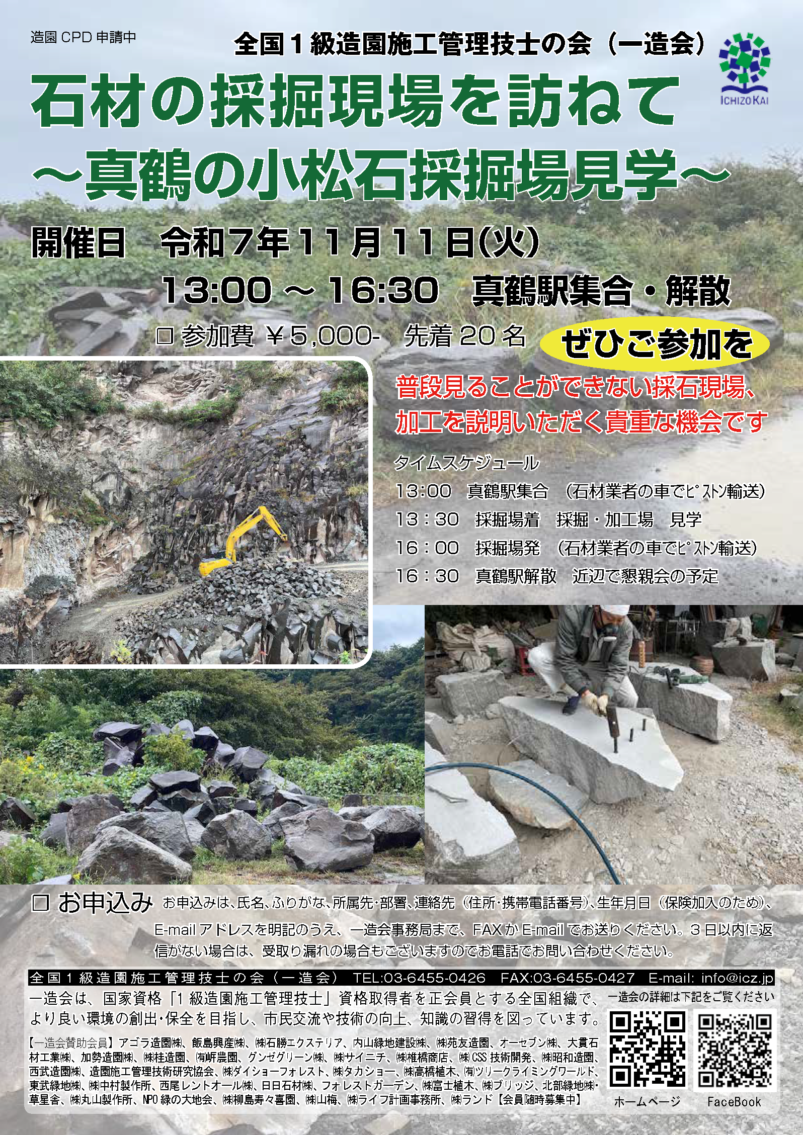 11/11 石材の採掘現場を訪ねて~真鶴の小松石採掘場見学~ 2025年10月22日 | コメントはまだありません ■ 催事:石材の採掘現場を訪ねて ~真鶴の小松石採掘場見学~ ■ 日時:2025.11.11 ㈫ ■ 集合:真鶴駅集合 13:30 開催案内は、下記の画像をクリック、またはこちらから開催案内(PDF)をダウンロードいただけます。 現場見学会, お知らせ・催事案内etc